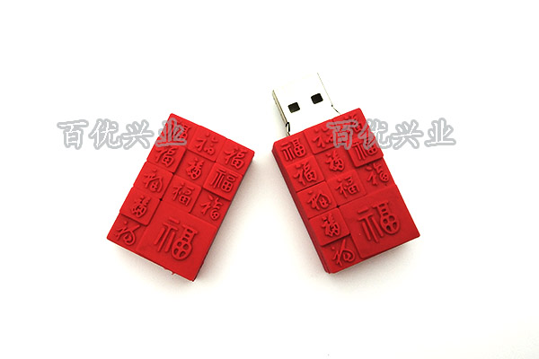 福字有着丰富多彩的内容,福、禄、寿、喜、财、安、康无一不属于吉的范畴。整个U盘头上福字式样点胶花纹的装饰,大红色的颜色,散发出强烈的传统文化气息,大红色搭配彰显出时尚和品质,受到广大用户的喜爱,选择点胶的方式来定制logo图案和宣传文字,文字颜色选择非常高档,绝对是最具中国风的企业宣传礼品。